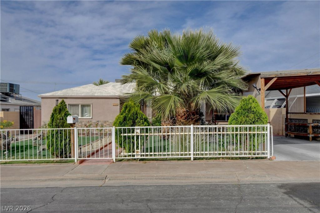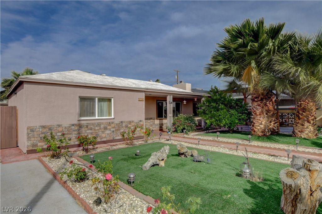 A prime opportunity awaits in a desirable location. This exquisite, upgraded single-story home boasts five bedrooms and three bathrooms, providing a cozy family retreat in an emerging neighborhood of Henderson. Notably, the property is free from homeowners association (HOA) restrictions. The property features ample parking space for several vehicles. The front yard is adorned with stunning palm trees, roses, and artificial grass turf, creating a picturesque ambiance. The backyard includes a detached casita with two bedrooms and one full bathroom, accessible via a separate entrance. A spacious covered patio with a fully equipped outdoor kitchen enhancing the resort-like atmosphere of the backyard. This exceptional opportunity presents a lucrative investment in the rapidly growing and developing city of Henderson. You can occupy one house while renting the casita for short-term stays, generating additional income to cover your mortgage.