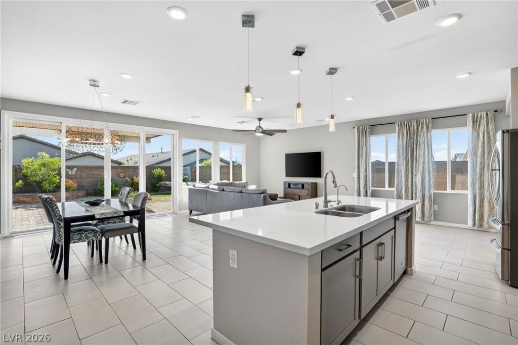 · I'm Gated community · Single-story 4BD/3BA + office · Solar-equipped (NV Energy bills near zero) · 0.5 mi to Sprouts & EoS Fitness · 1.2 mi to Aliante Nature Discovery Park · 1.5 mi to Aliante Casino + Hotel · Easy I-215 access. New construction (2023) in The Heights at Palmer Ranch. Open-concept layout with panoramic sliding glass doors opening to a covered patio and fully landscaped, fenced backyard. Island kitchen features handled gray cabinetry, quartz countertops, undermount sink, designer backsplash, and luxury appliances. Primary suite includes dual sinks, oversized walk-in shower, and custom walk-in closet with built-in storage. Dedicated home office with natural light. Extra-tall doors, built-in surround sound, smart home system, integrated security, and soft water loop. Finished 2-car garage. 3D tour and video tour coming soon.